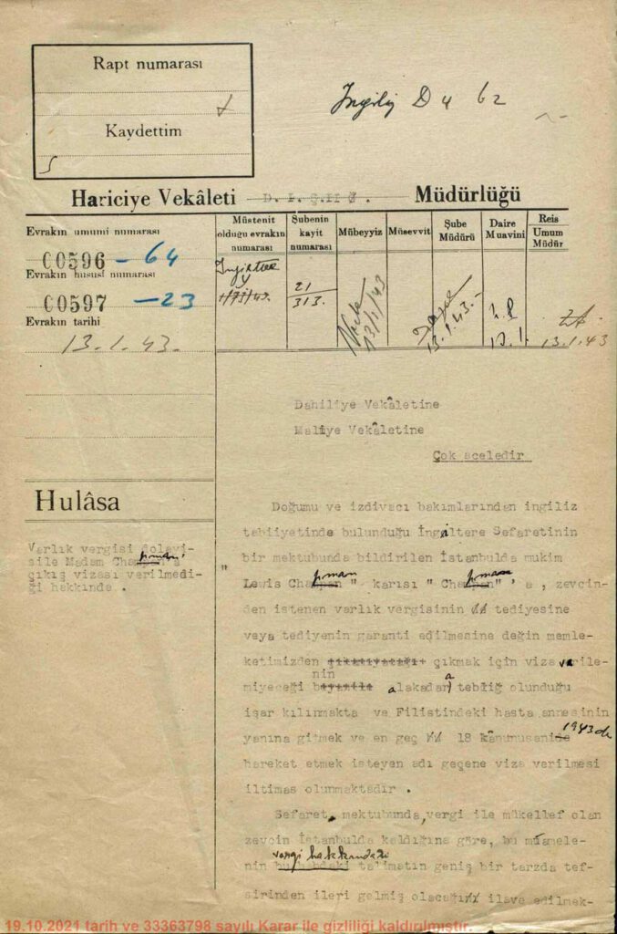 Doğumu ve izdivacı bakımlarından İngiliz tabiyetinde bulunduğu İngiltere Sefaretiin bir mektubunda bildirilen İstanbulda mukim Levis Chapman’ın karısı “Chapman”a zevcinden istenen varlık vergisinin tediyesine veya tediyenin garanti edilmesine değin memleketimizden çıkmak için viz verilmediğinin alakadara tebliğ olunduğu işar kılınmakta ve Filistin’deki hasta annesinin yanına gitmek ve en geç18 Kanunsani (Ocak) 1943 de hareket etmek isteyen adı geçene vize verilmesi iltimas olunmaktadır.